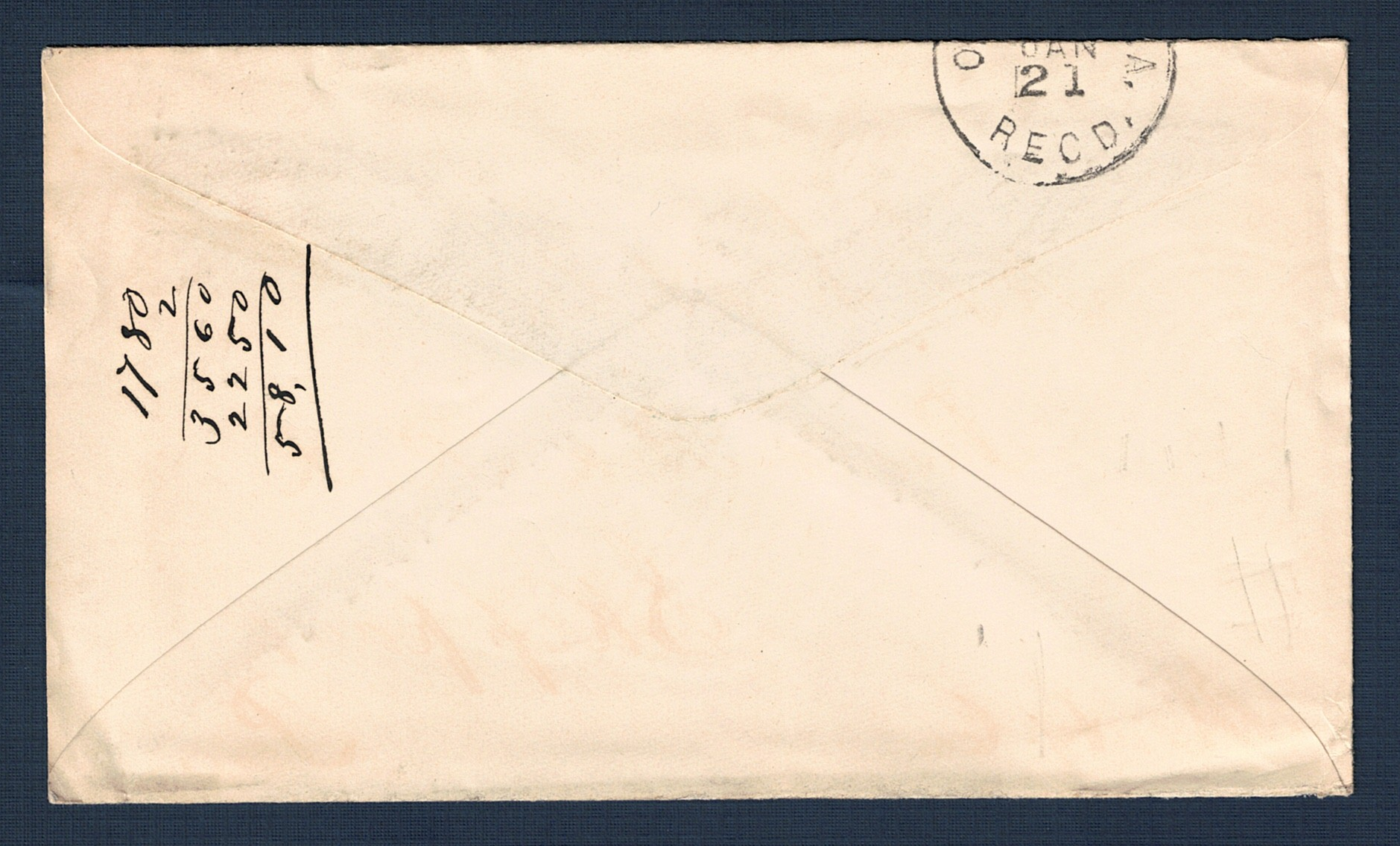 Although struck mostly off cover, the arrival handstamp on the back, ORLANDO, FLA. JAN 21 RECD., is a transit mark for eventual destination of Philadelphia then Skippack, PA. (It was common to use envelopes as scratch paper. Here someone multiplied 17.80 by 2 for a total of 35.60, then added 22.50 for a final total of 58.10.)