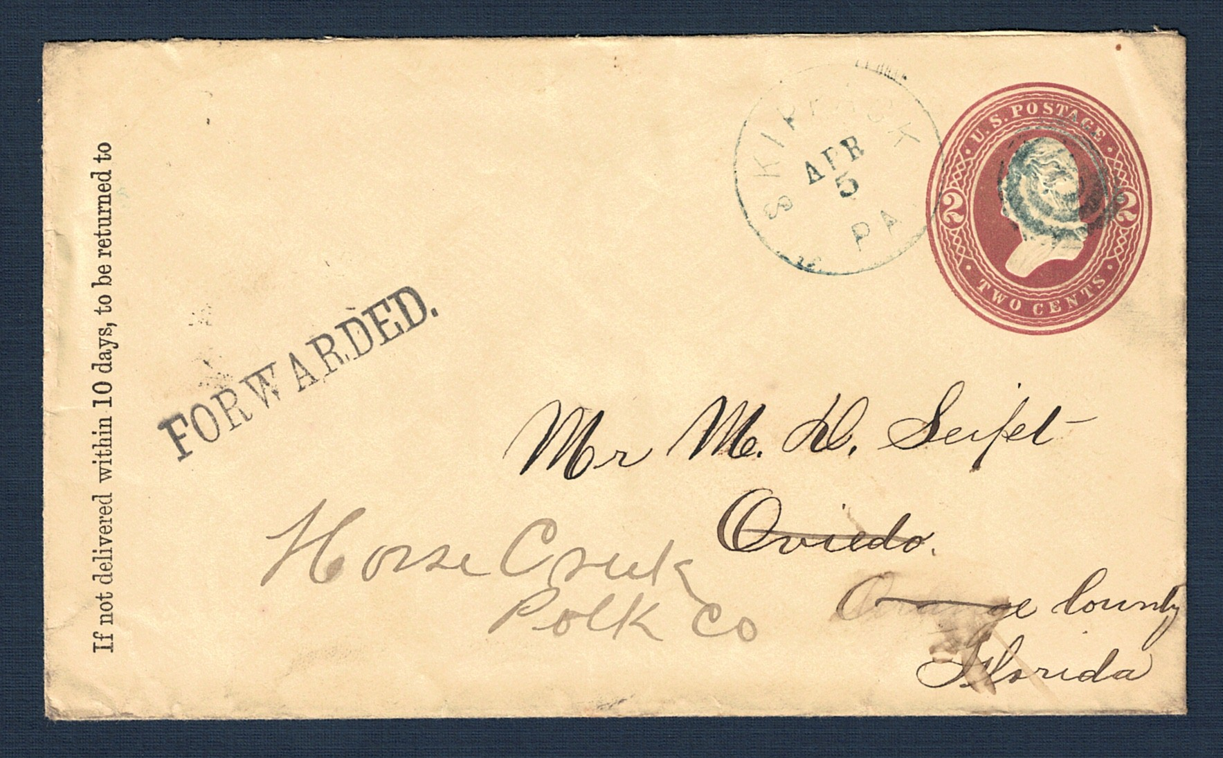 SKIPPACK PA, APR 5 (blue cancel) addressed to Mr M. D. Seipt, Oviedo, Orange County, Florida. However, it was forwarded to Horse Creek in Polk County, Florida. (Scott U279, Design U67, Die U45.)