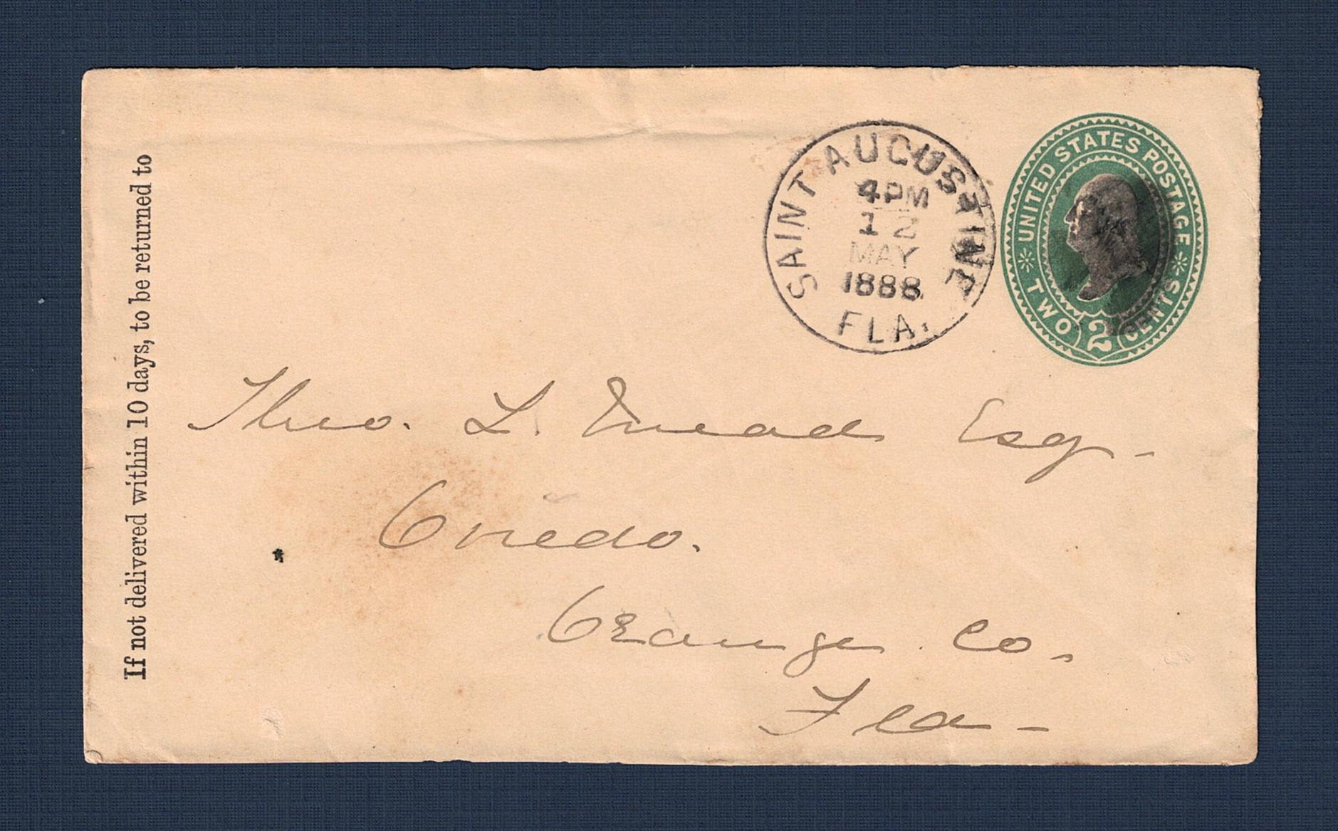 This envelope was dispatched from Saint Augustine, Florida, on May 12, 1888, destined for the town of Oviedo. It utilizes a green two-cent postage stamp depicting George Washington and includes a printed return instruction on the left margin for undelivered mail. The correspondence is addressed to Theo. L. Mead, Esq., noting the location within Orange County. A Saint Augustine circular postmark confirms the mailing time as 4 PM on the date of transit.