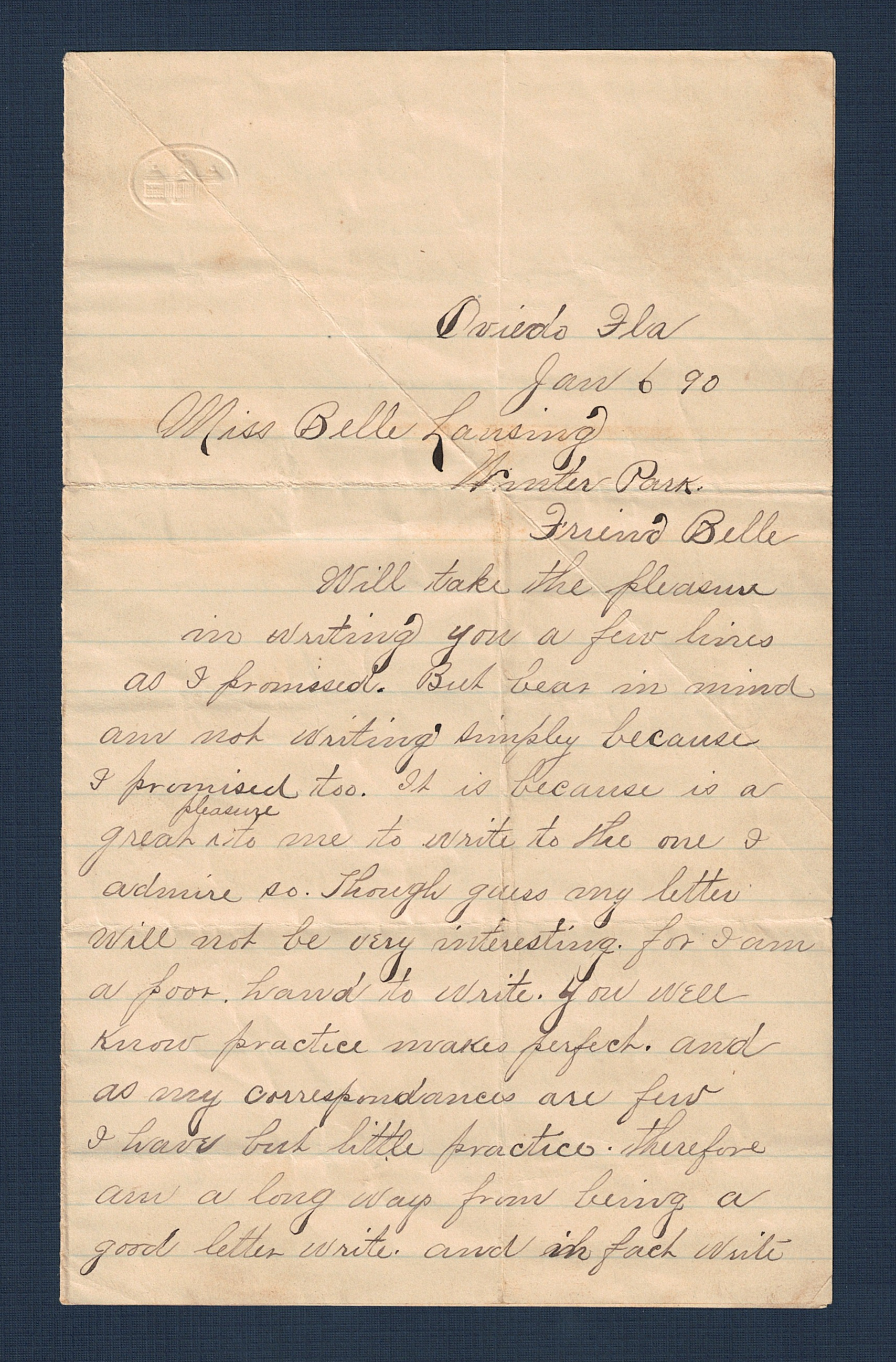 This letter, dated January 6, 1890, provides the internal context for the previously seen envelope. While the correspondence was written in Oviedo, it was carried to Sanford to be postmarked at 11 AM the following morning, likely to catch the southbound train heading toward Winter Park. The stationery features a subtle embossed crest in the upper left corner, and the handwriting is a personal, informal cursive common to the late 19th century.