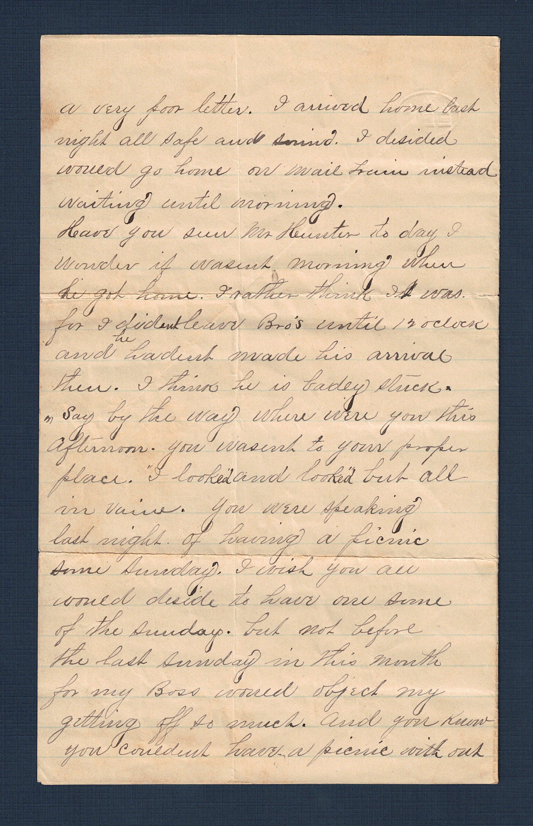 ... a very poor letter. I arrived home last night all safe and sound. I decided would go home on mail train instead waiting until morning. Have you seen Mr Hunter to day I wonder if wasn't morning when he got home. I rather think it was for I didn't leave Bro's until 12 oclock and he hadnt made his arrival then. I think he is badly stuck. Say by the way where were you this afternoon. You wasn't to your proper place. I looked and looked but all in vain. You were speaking last night of having a picnic some Sunday. I wish you all would decide to have one some of the Sunday but not before the last Sunday in this month for my Boss would object my getting off so much. And you know you couldn't have a picnic with out...