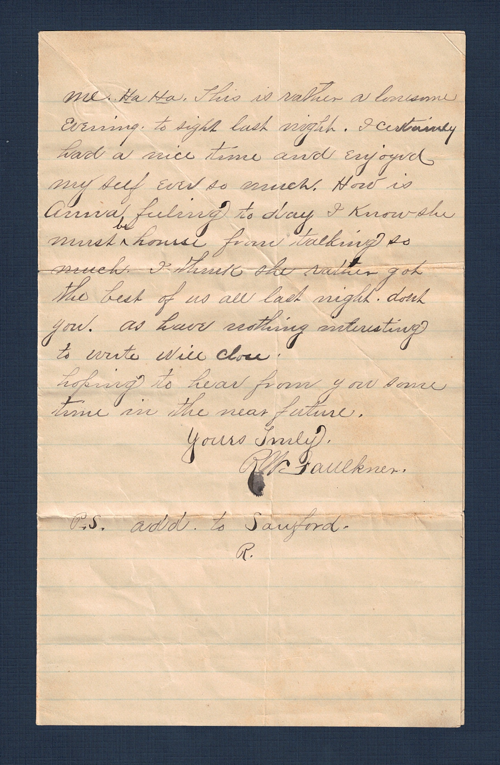 ... me. Ha Ha. This is rather a lonesome evening to sight last night. I certainly had a nice time and enjoyed my self ever so much. How is Anna feeling to day I know she must be hoarse from talking so much. I think she rather got the best of us all last night don't you. As have nothing interesting to write will close. Hoping to hear from you some time in the near future.