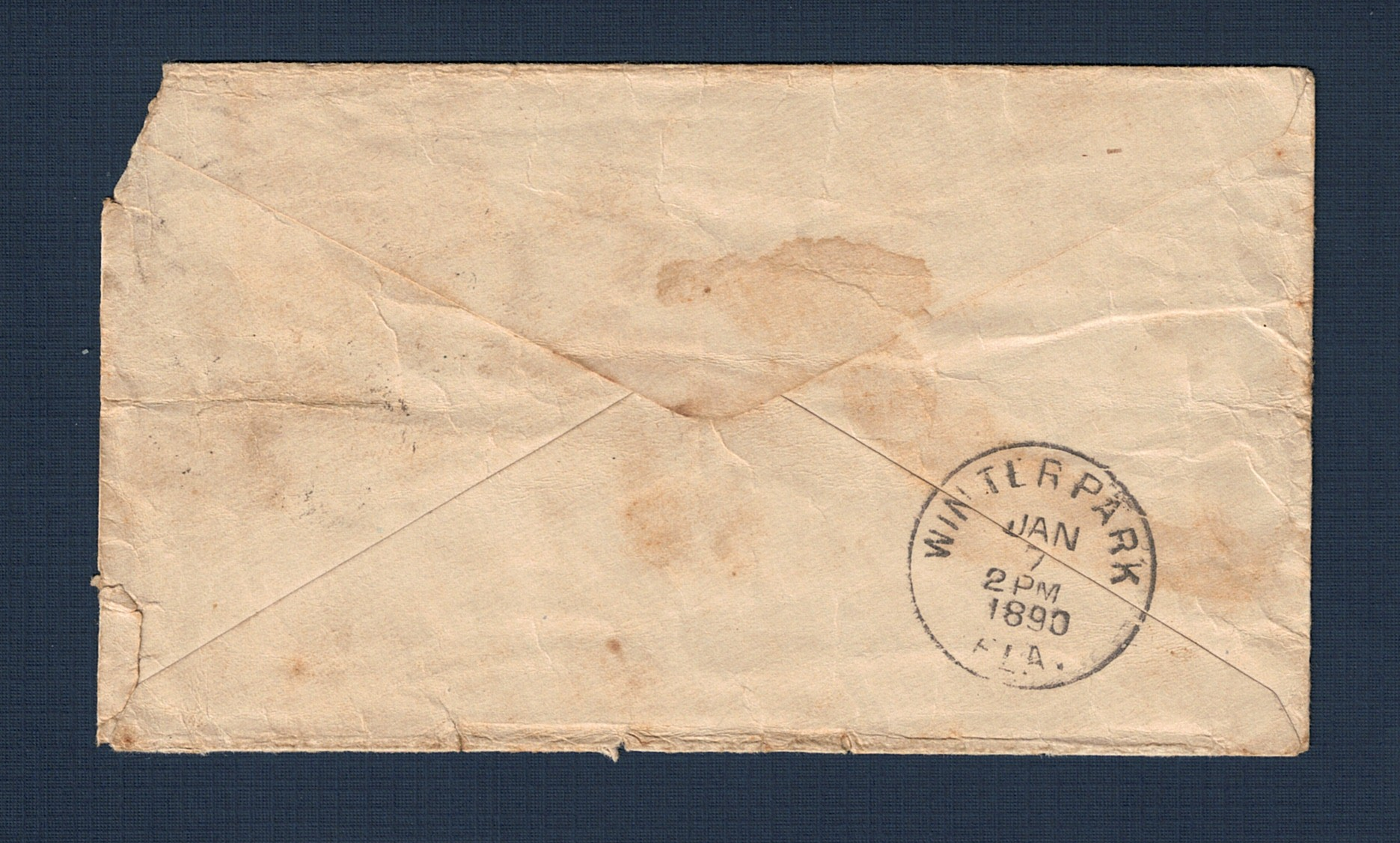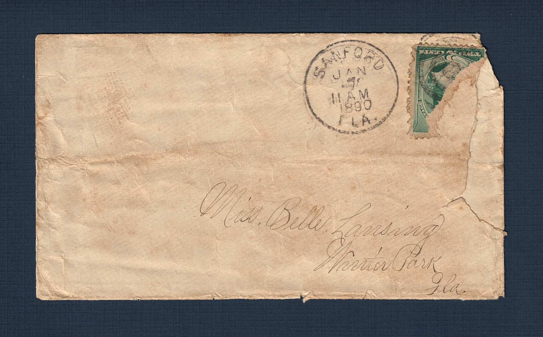 This 1890 postal cover, addressed to Miss Belle Lansing in Winter Park, Florida, shows the rapid transit of mail in Central Florida at the end of the 19th century. Although the envelope is heavily worn and the green two-cent George Washington stamp is partially torn, the postmarks remain remarkably legible. The front displays a Sanford circular date stamp from 11 AM on January 7, while the reverse features a Winter Park receiving backstamp from just three hours later at 2 PM on that same day. This indicates the correspondence likely traveled via the South Florida Railroad, which connected Sanford to Winter Park during that era.