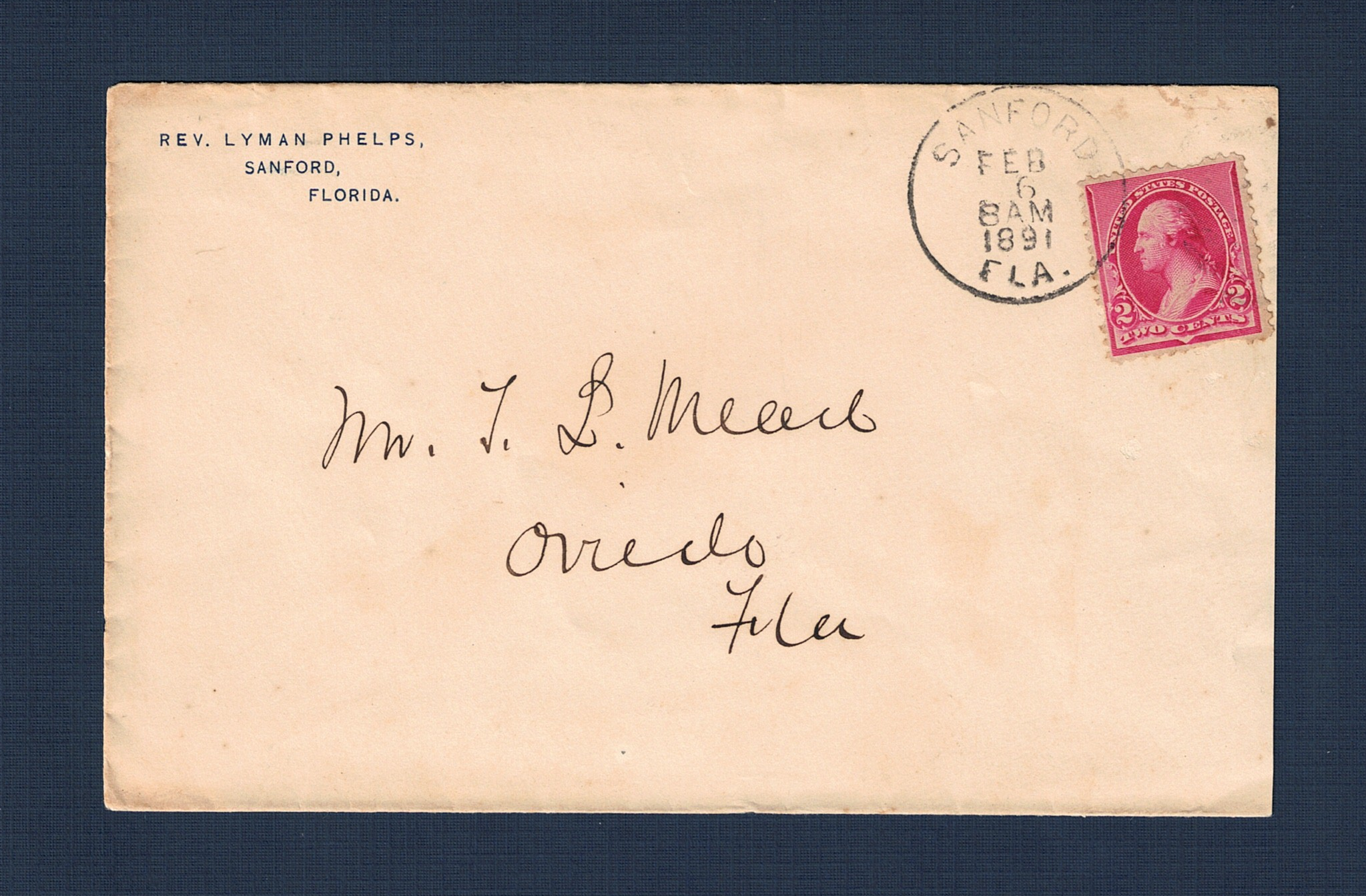 This 1891 postal cover was mailed from Sanford to T. L. Mead in Oviedo on February 6. It features a carmine two-cent George Washington stamp and a 5 AM Sanford postmark. The envelope includes a printed corner card for the Rev. Lyman Phelps, a significant figure in Florida's early agricultural and religious history. Phelps served as the first rector of the Episcopal Church of the Holy Cross in Sanford and was a renowned citrus pioneer. He was famously known for his work in hybridizing citrus and for his "Phelps" nursery, which contributed to the development of the Florida orange industry. Given that both Phelps and Mead were deeply involved in horticultural experimentation, this correspondence likely involved their shared interest in the botanical sciences.