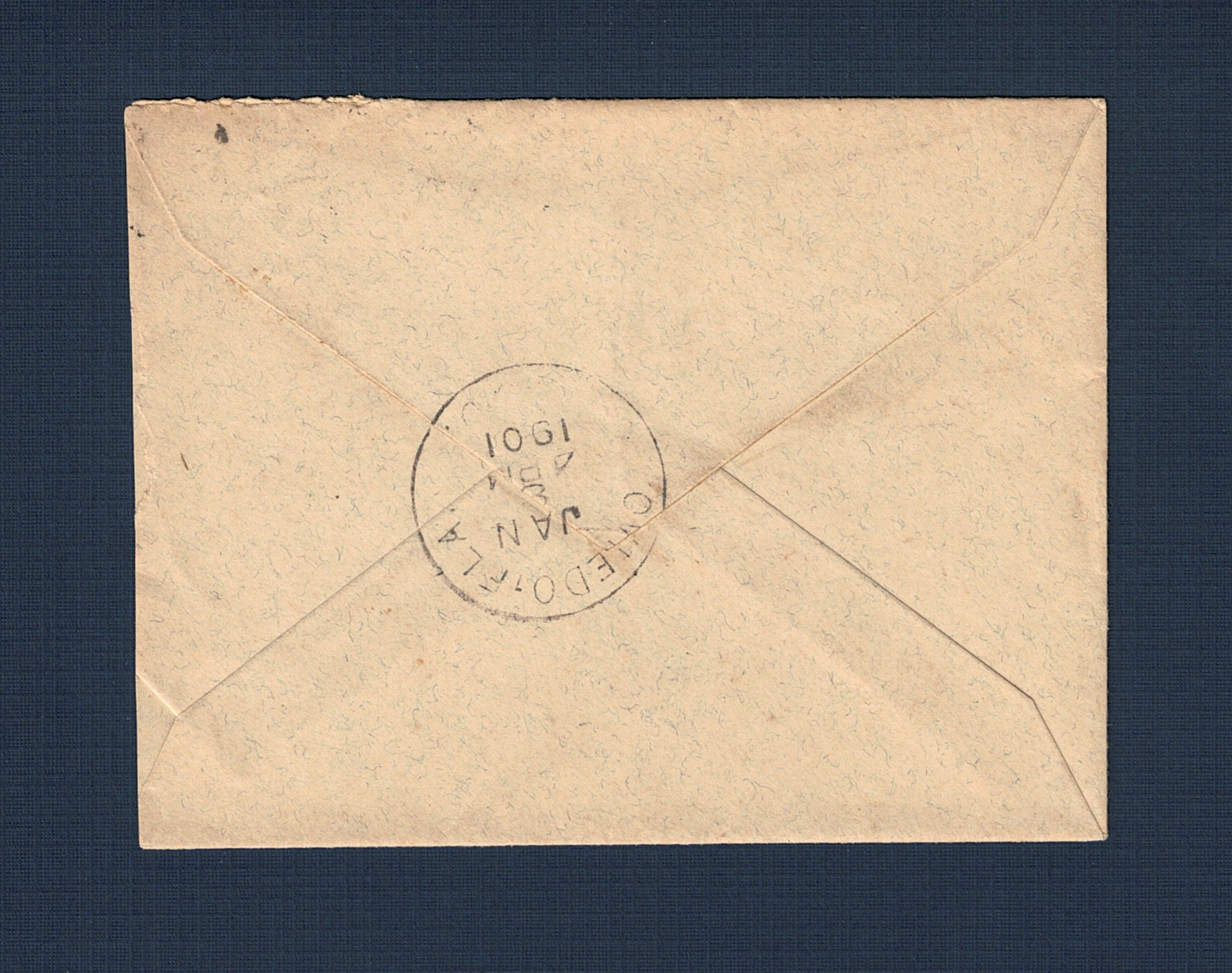 The circular backstamp on the reverse of this 1901 envelope indicates that the letter was received at the Oviedo, Fla. post office on Jan 8, 1901, at 4 PM. This official mark, struck just hours after the letter's morning dispatch from Lake Maitland, demonstrates the remarkable speed and reliability of the local rail mail service connecting Central Florida settlements at the turn of the century.