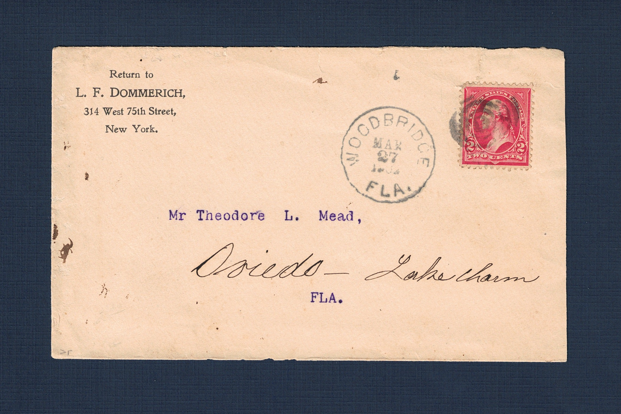 This 1902 cover represents a fascinating "local-to-local" exchange between two Gilded Age figures, mailed from Woodbridge, Florida, to Theodore L. Mead at Lake Charm on March 27. The sender, L. F. Dommerich, was a wealthy New York textile magnate who, like Mead, sought refuge in Florida's climate; his return address at 314 West 75th Street in Manhattan is printed on the corner, though he was clearly writing from his citrus estate in Woodbridge, a community that sat between Maitland and Casselberry. The envelope is a mix of high-society technology and rural reality, featuring Mead's name cleanly typewritten—a rarity for personal mail of the time—while the destination of "Oviedo—Lake Charm" is scrawled in an elegant, flowing script below.