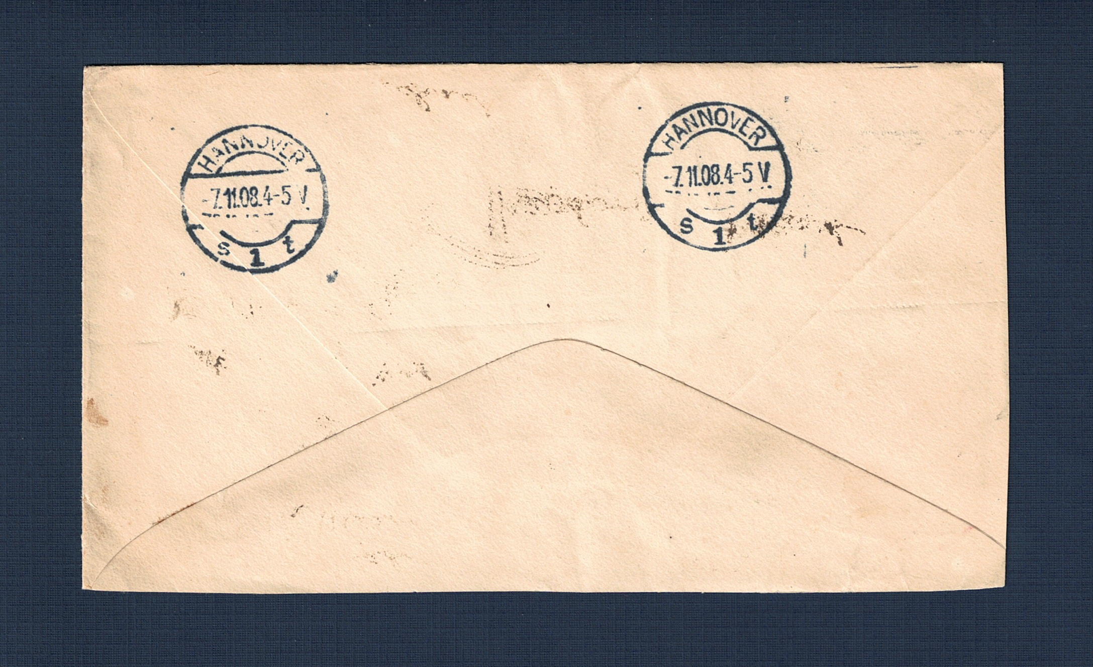 The reverse of this 1908 international cover features two identical circular receiving stamps from the German postal system. Both marks are transcribed as HANNOVER, dated -7.11.08.4-5 V, and include the delivery district or station identifier s 1 t. In the German dating format of the era, this indicates the letter arrived in Hannover on November 7, 1908, between the hours of 4:00 and 5:00 AM (V for Vormittag). These crisp, dual strikes provide definitive proof of the letter's successful arrival and processing at its final destination city just eleven days after its dispatch from Florida.