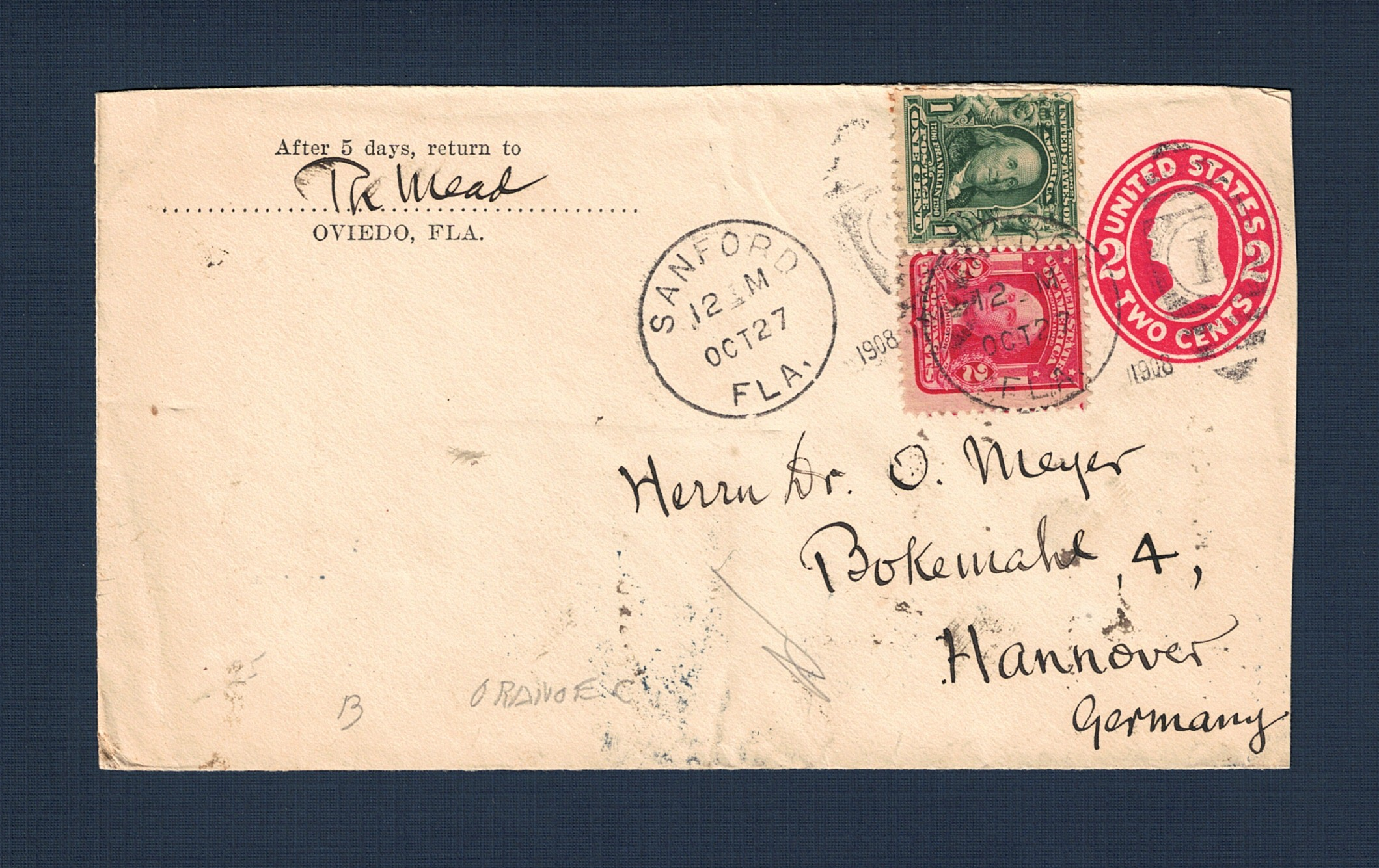 This 1908 international cover documents a journey from Theodore L. Mead in Oviedo to Dr. O. Meyer in Hannover, Germany. Mailed on October 27, the envelope is franked with a one-cent green Franklin and a two-cent carmine Washington stamp to meet the international rate alongside the two-cent postal stationery indicia. Interestingly, while the letter originated in Oviedo, it bears a prominent Sanford, Fla. dispatch postmark from 12 PM that same day. This suggests that the mail was either dropped directly at the larger Sanford hub to catch a faster outbound connection or was rapidly shuttled there via the local rail line shortly after being posted.