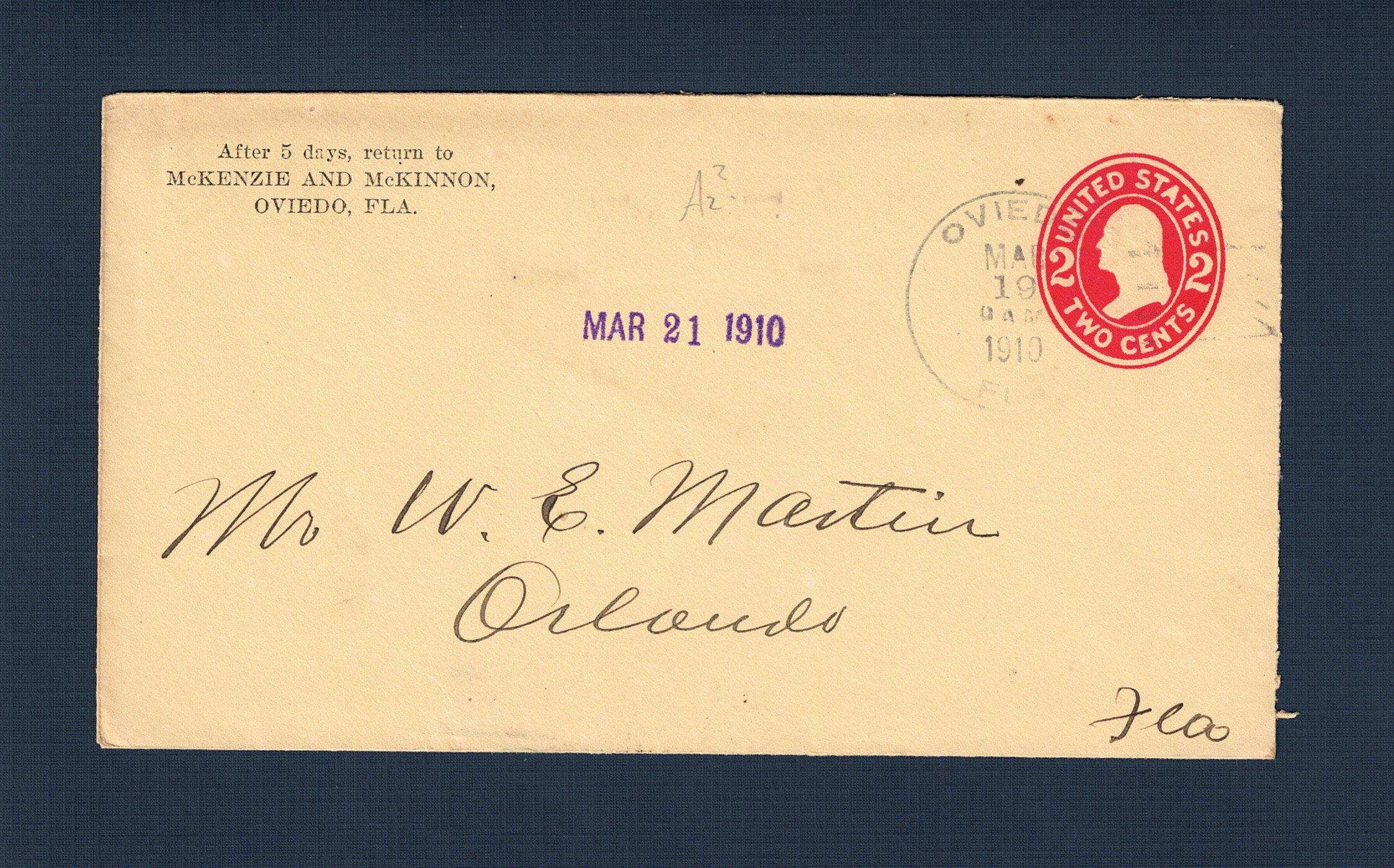 This 1910 postal stationery cover was dispatched from Oviedo, Florida, on March 19 at 9 AM, addressed to W. E. Martin in nearby Orlando. The envelope features a pre-printed two-cent red Washington indicia and a professional return address for McKenzie and McKinnon, a prominent local mercantile and naval stores firm that played a significant role in Oviedo's early commercial development. Similar to other correspondence from this era, the front of the cover bears a purple auxiliary date stamp of MAR 21 1910, likely marking the date it was received or filed by the recipient. The reverse of the cover is notably blank, lacking the transit or receiving marks seen on earlier international or multi-stop frontier mail, which reflects the streamlined processing for local mail moving along the established rail corridor between Oviedo and Orlando by the end of the decade.