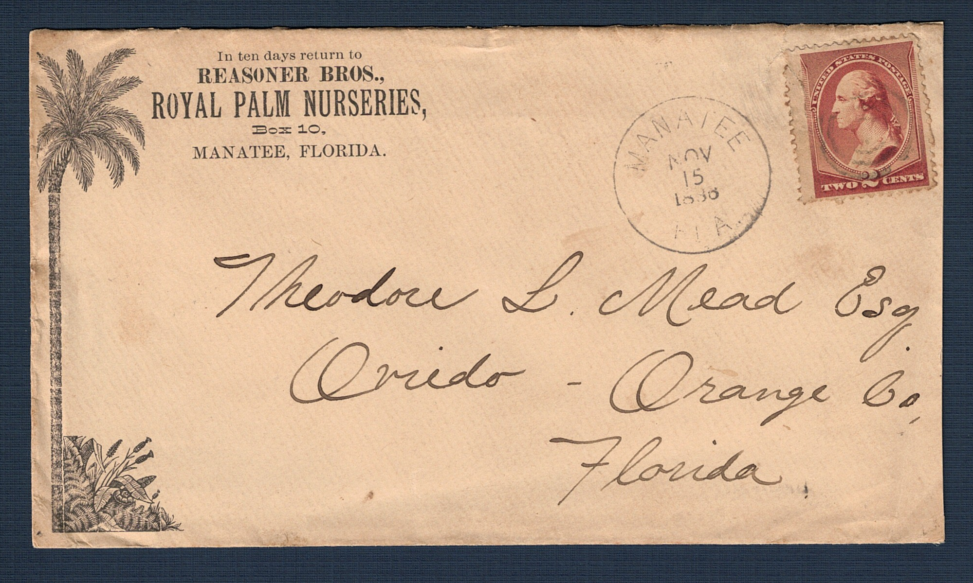 MANATEE FLA, NOV 15, 1886 addressed to Theodore L. Mead Esq, Oviedo - Orange Co, Florida. Early advertising cover from the Reasoner Brothers, Royal Palm Nurseries, Box 10, Manatee, Florida. (Scott 210)